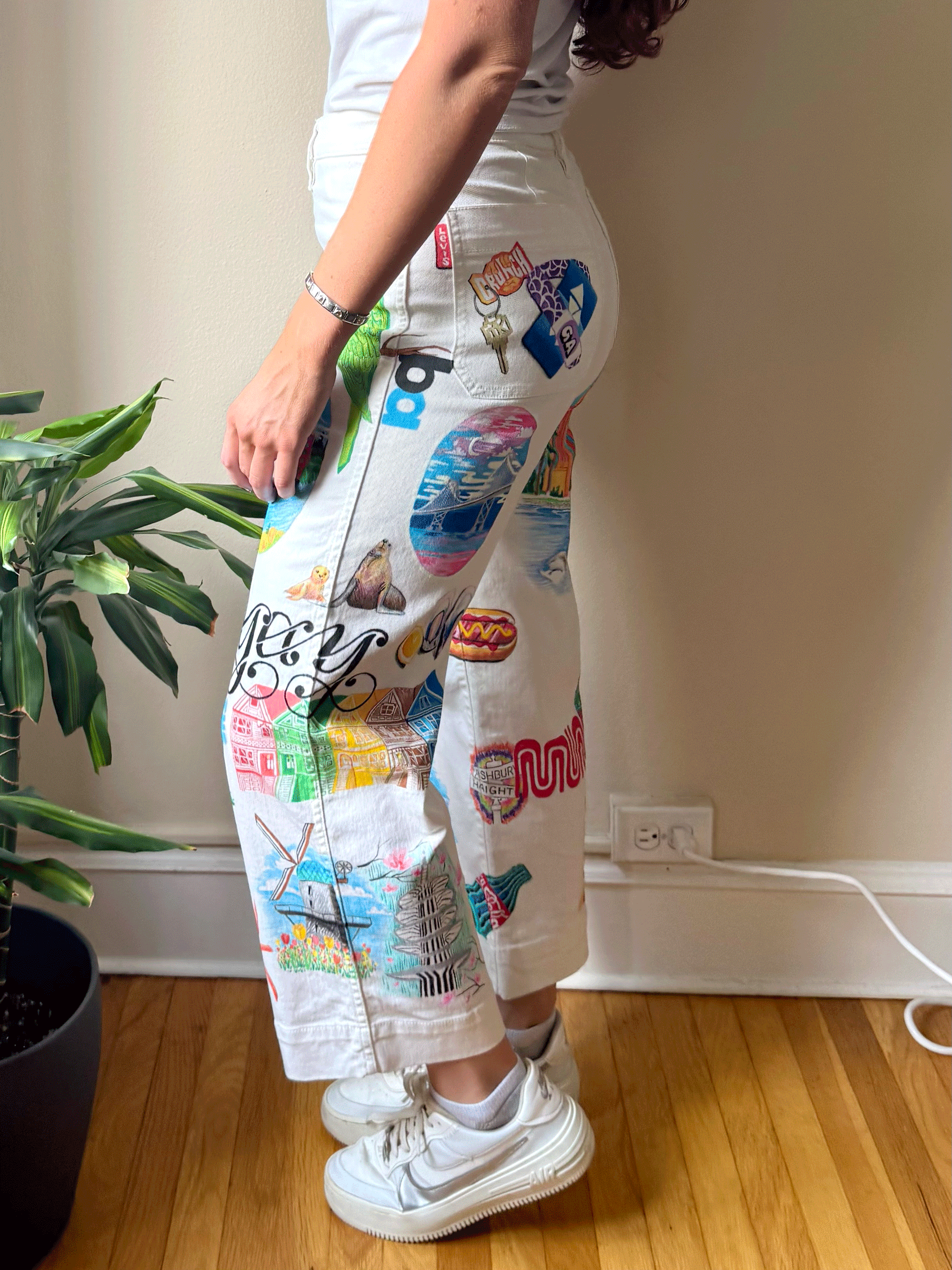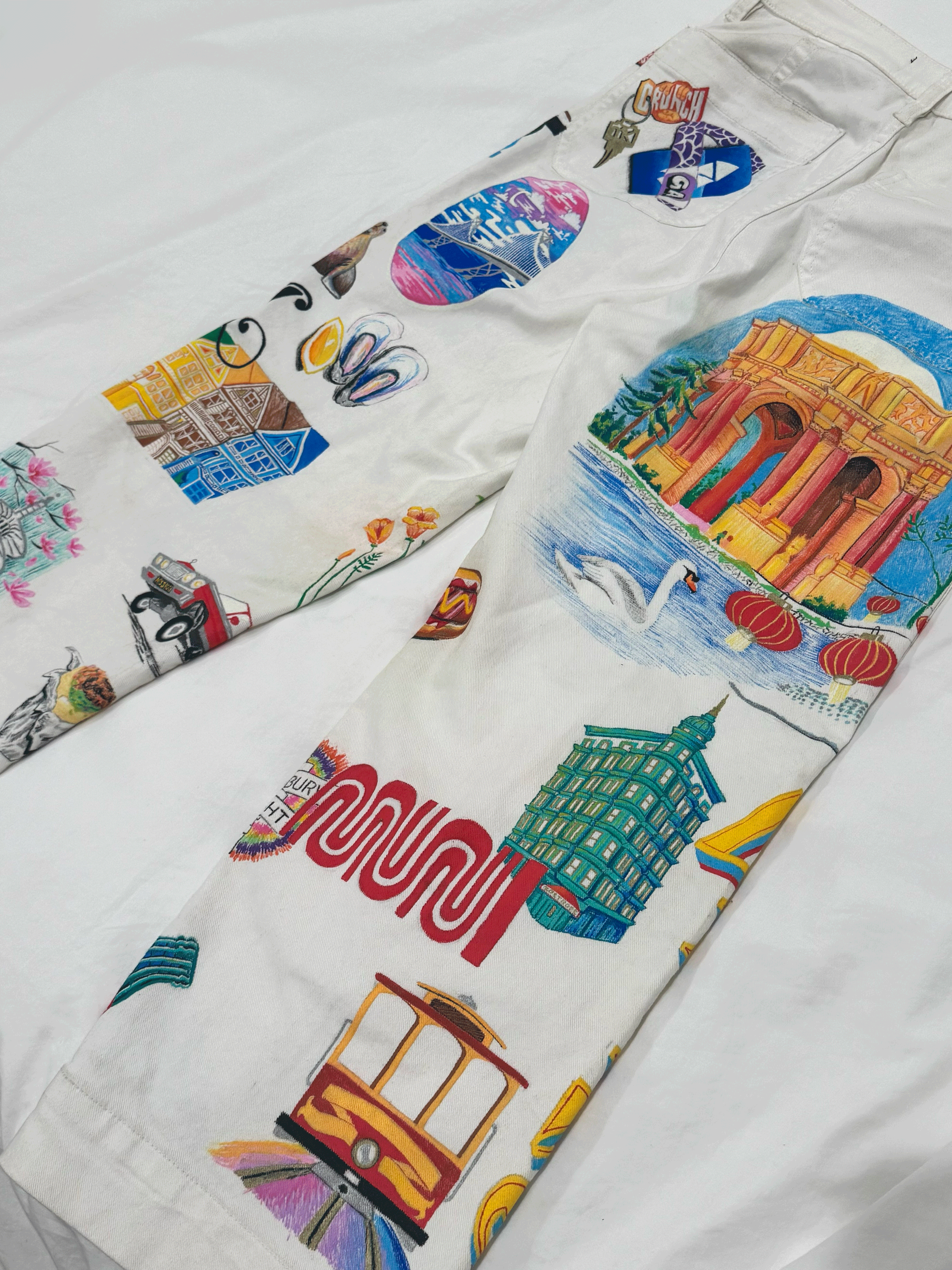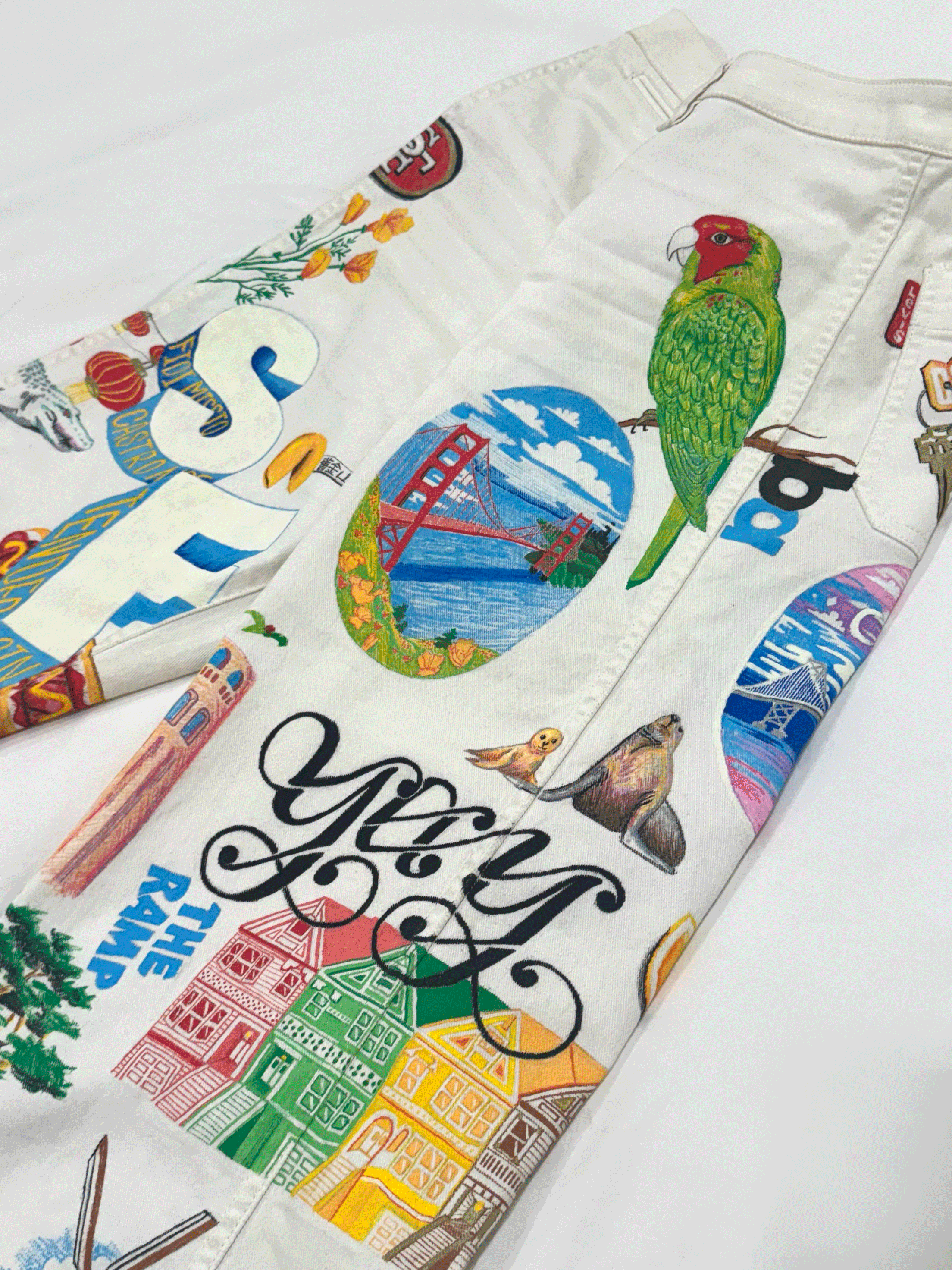 Last year, I thrifted a pair of damaged pants. When a few stains and scratches didn’t come out in the wash, I decided to paint over them! I began documenting the process on Tiktok, and grew a following from it. On them, you’ll find the painted ladies, POFA (Palace of Fine Arts), a cablecar, a Mission burrito, the Bay and Golden Gate bridges, and so many other iconic SF vignettes. After spending 5 months on them, the SF Painted Pants are one of my proudest projects to date.
